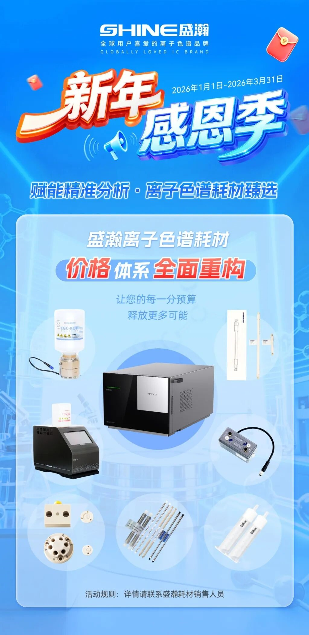 精準(zhǔn)分析,耗材是根基。我們深知你對(duì)品質(zhì)的堅(jiān)守,也體諒你對(duì)成本的考量。此次感恩季,盛瀚離子色譜耗材價(jià)格體系全面重構(gòu),從核心配件到常規(guī)耗材,均以更具誠(chéng)意的姿態(tài),助力你的實(shí)驗(yàn)研究。